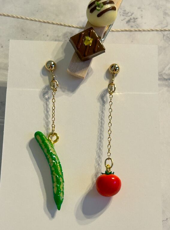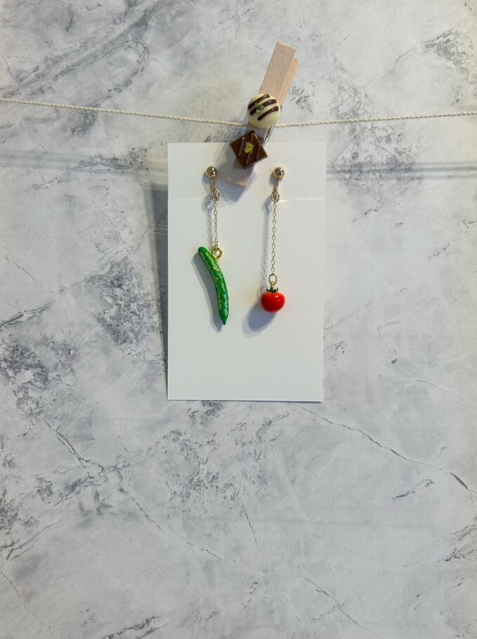 ミニチュアサイズのきゅうりとトマトをモチーフにした、おしゃれで愛らしいイヤリングです。細部までこだわったデザインは、まるで本物のような質感と色合いが特徴です。