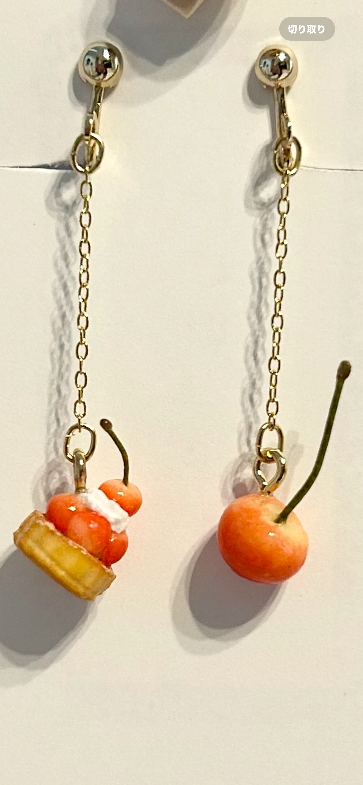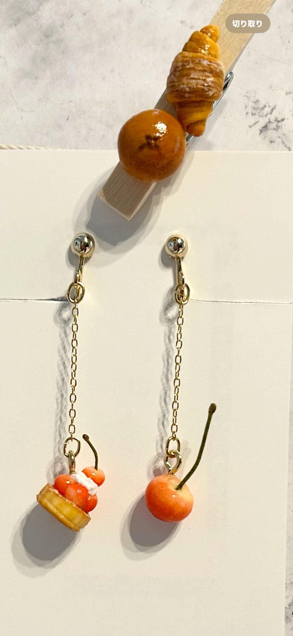 ミニチュアサイズのさくらんぼとタルトをモチーフにした、愛らしいイヤリングです。♡